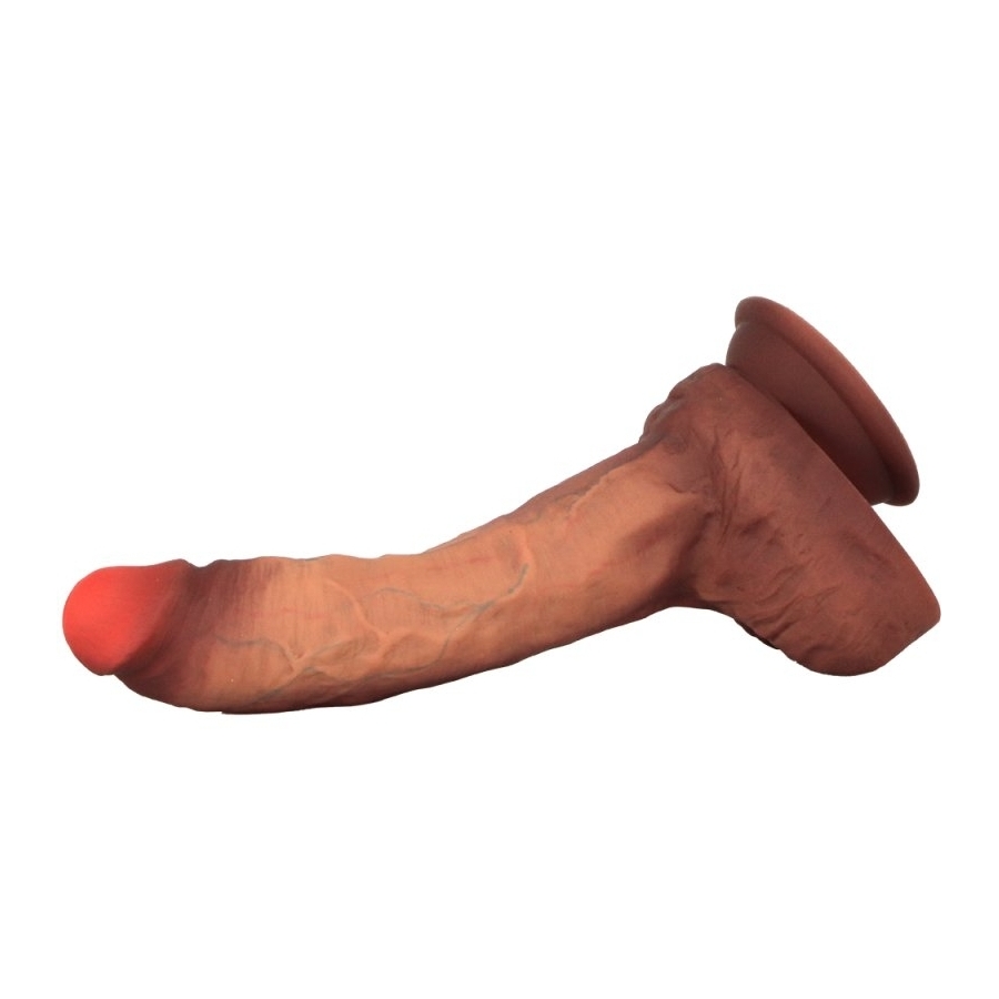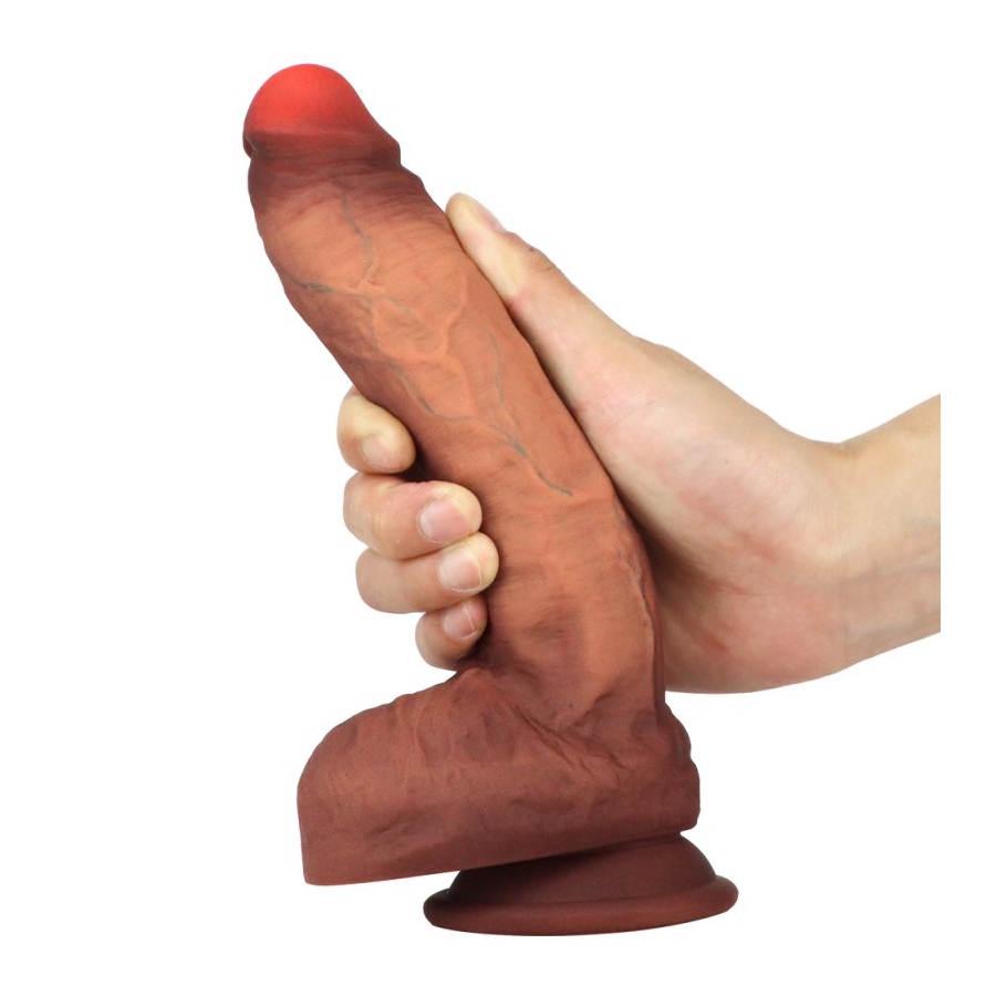 Realistischer, gerader Dildo mit dekalottierter Eichel, strukturierter Oberfläche und runden Beuteln.