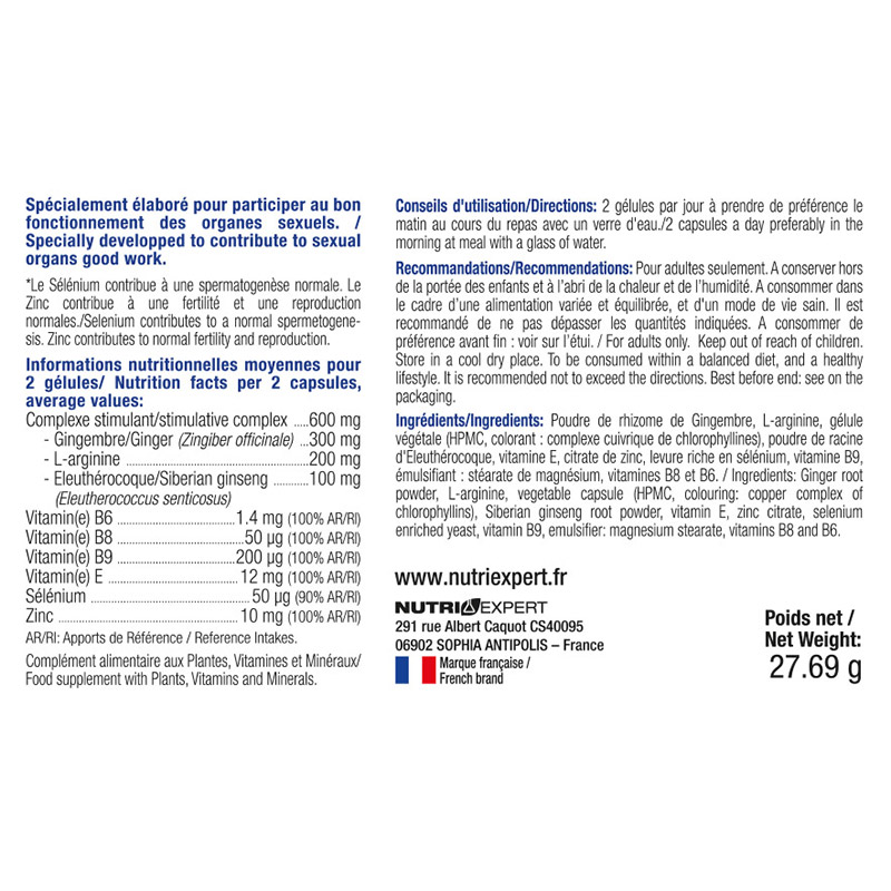 Zutaten: Ingwer-Rhizom-Pulver, L-Arginin, pflanzliche Kapsel (HPMC, Farbstoff: Kupferkomplex von Chlorophyllinen, Eleuthero-Wurzelpulver, Vitamin E, Zinkcitrat, selenreiche Hefe, Vitamin B9, Emulgator: Ingwerstearat-Magnesium, Vitamine B8 und B6 .