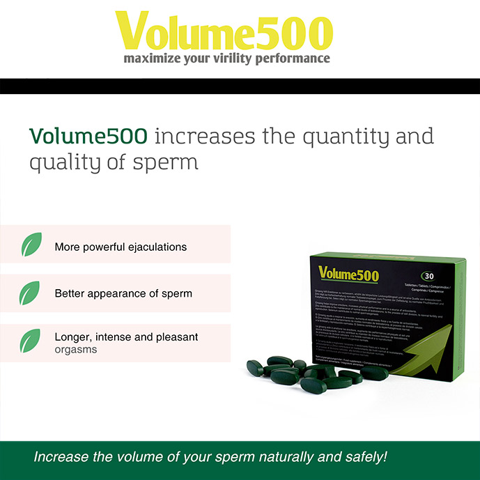 Volume500 ist ein Nahrungsergänzungsmittel aus natürlichen, pflanzlichen Inhaltsstoffen, Vitaminen und Mineralstoffen, die dazu dienen, die Qualität und Quantität der Spermien zu erhöhen und gleichzeitig stärkere Ejakulationen hervorzurufen.