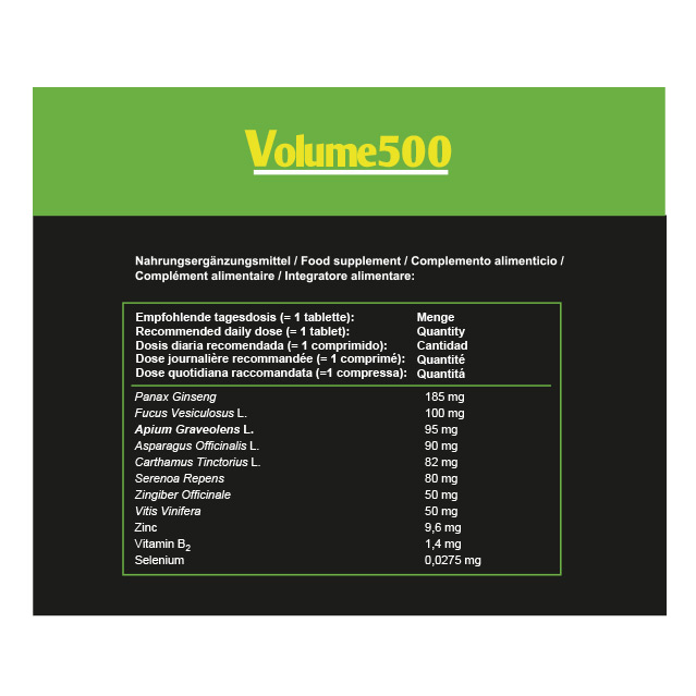Volume500 ist ein Nahrungsergänzungsmittel in Tablettenform aus natürlichen Inhaltsstoffen, um die Qualität der Spermien zu verbessern, indem es ihre Menge erhöht und so zu mehr Potenz verhilft.